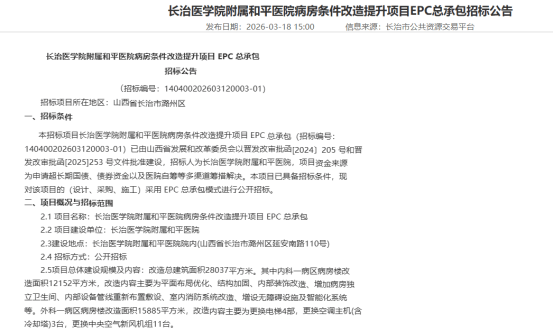 在山西省长治市,长治医学院附属和平医院病房条件改造提升项目已于3月18日发布EPC总承包招标公告。该项目改造总建筑面积达28037平方米,覆盖内科一病区和外科一病区病房楼。