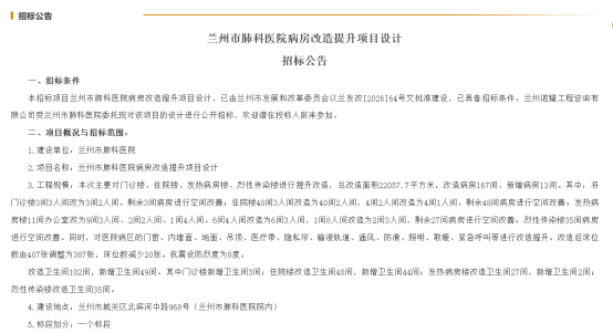 地处西北的兰州市肺科医院也于近日发布病房改造提升项目设计招标公告。项目计划对门诊楼、住院楼、发热病房楼、烈性传染楼进行全面提升,总改造面积22057.7平方米。改造涉及病房167间,将通过调整房型新增13间病房,并将门诊楼的3人间改为2人间,住院楼的40间3人间改为2人间等。同时,项目将对病区的门窗、内墙面、地面、医疗带、隐私帘、紧急呼叫系统等进行全面升级,并改造卫生间102间、新增卫生间49间。